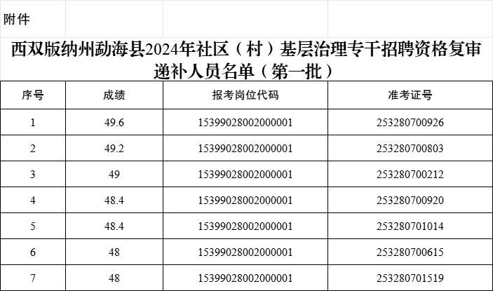 按照云南省2024年社區(qū)(村)基層治理專干招聘工作安排,因部分考生放棄或資格復(fù)審不合格,在筆試合格分?jǐn)?shù)線以上考生中,按成績(jī)由高到低順序進(jìn)行遞補(bǔ)?,F(xiàn)將西雙版納州勐??h關(guān)于云南省2024年社區(qū)(村)基層治理專干招聘資格復(fù)審遞補(bǔ)人員名單(第一批)予以公示。
