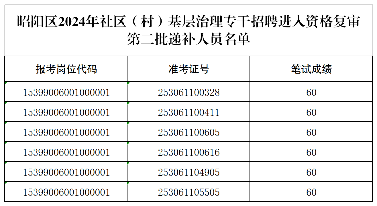 附件:昭陽區(qū)2024年社區(qū)(村)基層治理專干招聘進(jìn)入資格復(fù)審第二批遞補(bǔ)人員名單