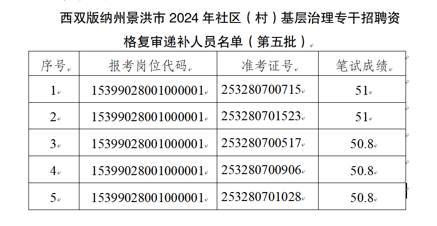 按照云南省2024年社區(qū)(村)基層治理專(zhuān)干招聘工作安排,因部分考生放棄或體檢不合格,在筆試合格分?jǐn)?shù)線以上考生中,按成績(jī)由高到低順序進(jìn)行遞補(bǔ)?,F(xiàn)將西雙版納州景洪市關(guān)于云南省2024年社區(qū)(村)基層治理專(zhuān)干招聘資格復(fù)審遞補(bǔ)人員名單(第五批)予以公示。