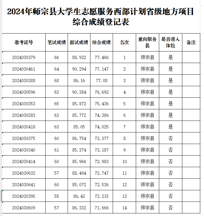 師宗縣2024年大學(xué)生志愿服務(wù)西部計(jì)劃省級(jí)地方項(xiàng)目面試成績(jī)、綜合成績(jī)公告