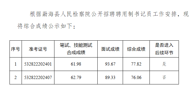 勐??h人民檢察院2024年公開招聘 聘用制書記員綜合成績公示