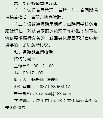 昆明市中華小學教育集團成立于2019年12月,以昆明市中華小學為龍頭學校,目前一校十址。依據(jù)《中共昆明市委辦公室 昆明市人民政府辦公室關(guān)于印發(fā)<昆明市銀齡講學三年行動計劃(2021—2023年)>的通知》(昆辦通〔2021〕6號),為深入推進昆明市中華小學教育集團的核心競爭力,提升教育集團的教育教學質(zhì)量,昆明市中華小學教育集團2024年計劃引進銀齡講師若干名,并常年引進銀齡講師?,F(xiàn)將有關(guān)事宜公告如下: