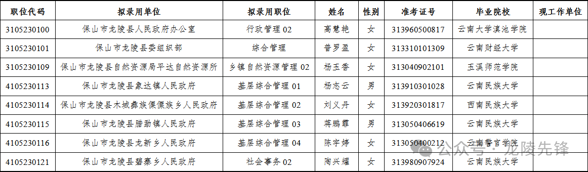 根據(jù)云南省2024年度考試錄用公務(wù)員工作有關(guān)規(guī)定,經(jīng)筆試、資格復(fù)審、面試、體檢、考察、大職位選崗等程序,現(xiàn)將龍陵縣2024年第二批擬錄用人員公示如下: