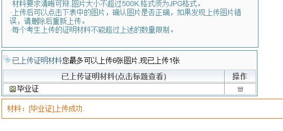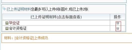 10、需要繼續(xù)上傳證明材料的操作同上操作法。上傳完全部證明材料后,點(diǎn)擊左欄中“證明材料管理”,可以看到已經(jīng)上傳的所有證明材料,如果需要?jiǎng)h除,可點(diǎn)擊操作欄中的拉圾桶圖標(biāo)按鈕進(jìn)行操作。如下: