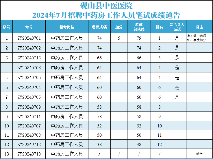硯山縣中醫(yī)醫(yī)院2024年7月招聘中藥房工作人員筆試成績(jī)通告