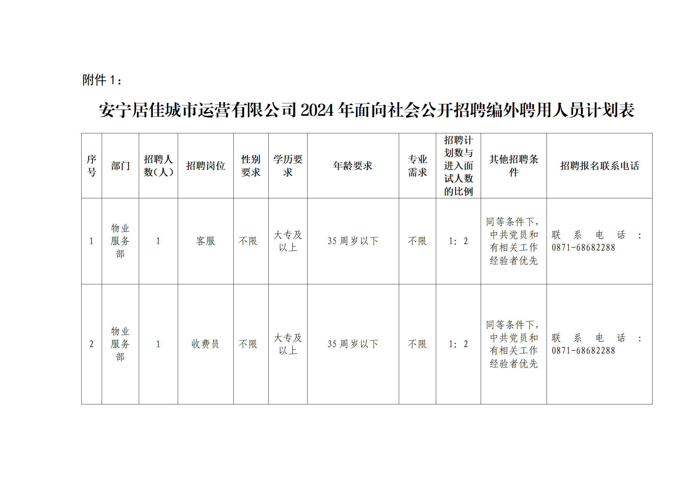 1.安寧居佳城市運營服務有限公司公開招聘編外聘用計劃