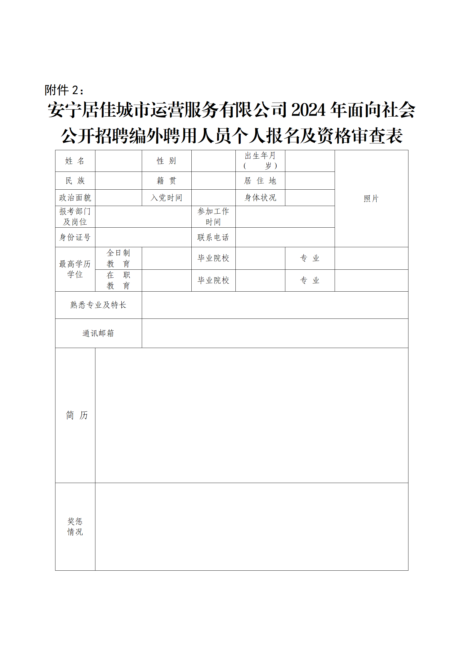 2.安寧居佳城市運營服務有限公司公開招聘編外聘用人員個人報名及資格審查表