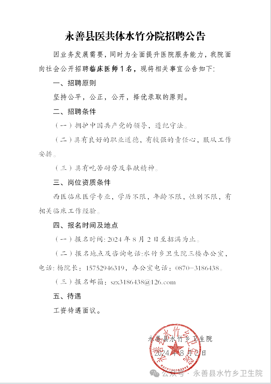 2024年7月昭通市永善縣醫(yī)共體水竹分院招聘公告
