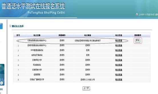 2、進入測試站點選擇頁面,此處選擇云南省普通話培訓(xùn)測試中心測試站,點擊右側(cè)的報名按鈕。