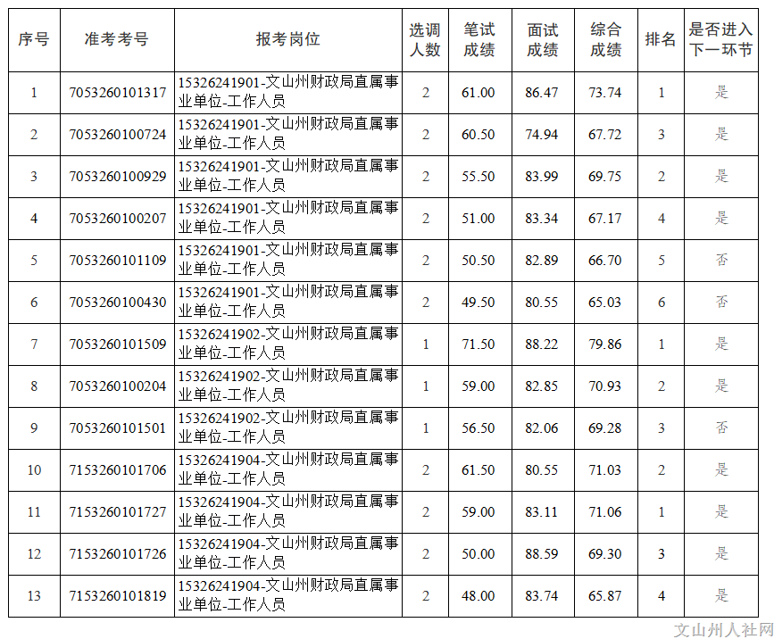 附件:2024年文山州財政局直屬事業(yè)單位公開選調(diào)工作人員面試成績及進入下一環(huán)節(jié)人員名單