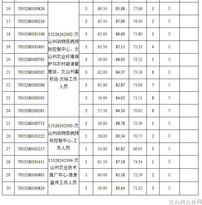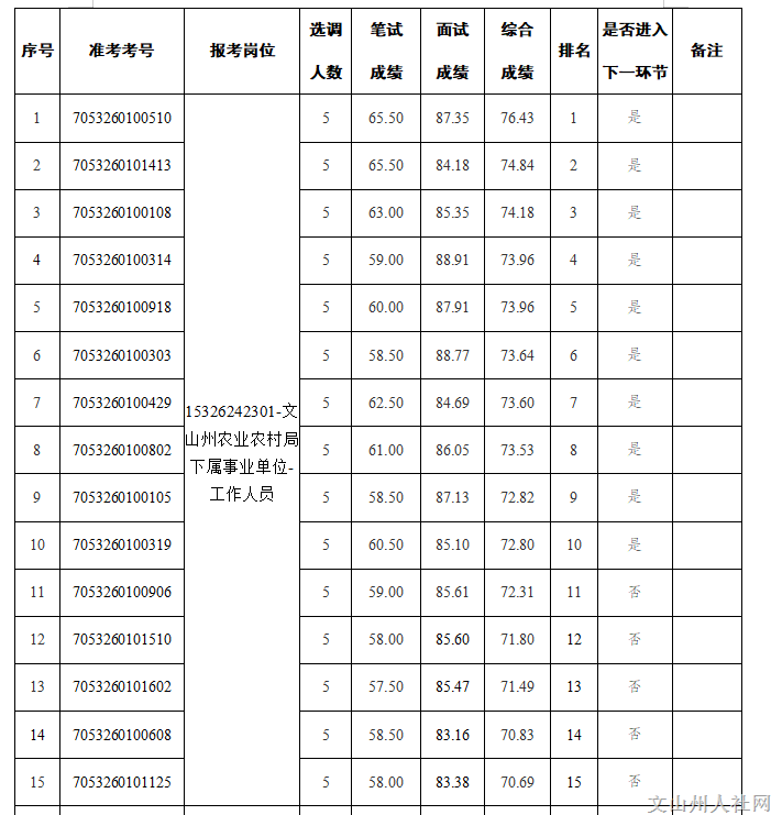 附件:2024年文山州農(nóng)業(yè)農(nóng)村局直屬事業(yè)單位公開選調(diào)工作人員面試成績和進(jìn)入下一環(huán)節(jié)人員名單