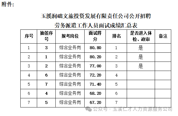 玉溪潤(rùn)礎(chǔ)文旅投資發(fā)展有限責(zé)任公司公開(kāi)招聘勞務(wù)派遣工作人員面試成績(jī)公示
