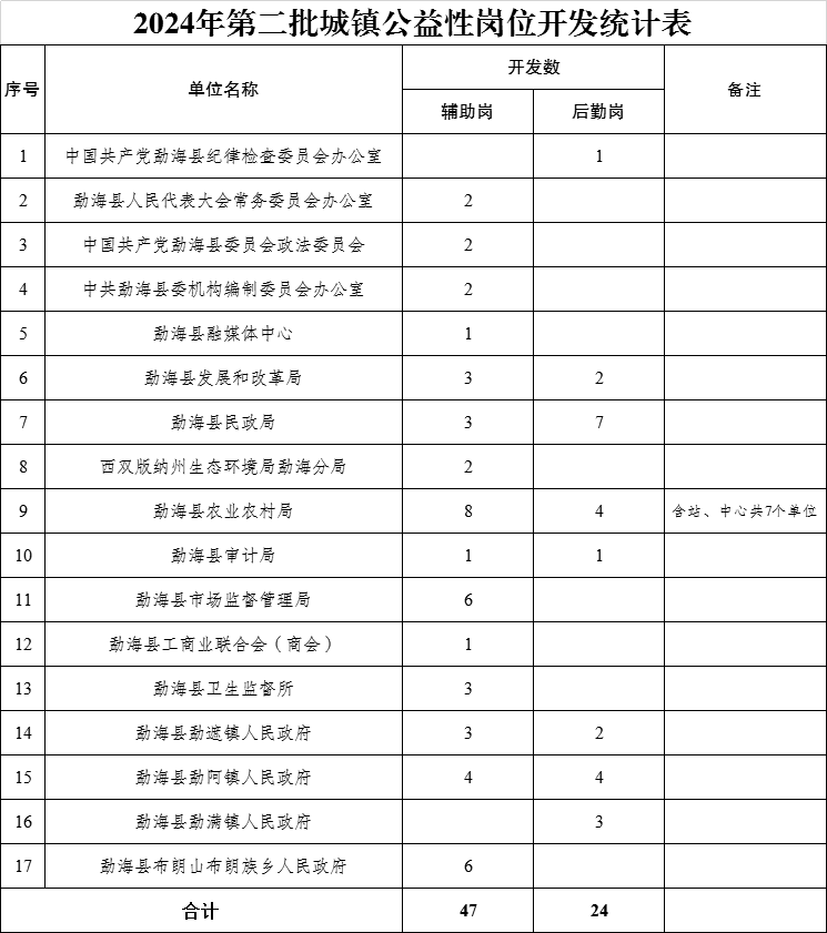 招聘崗位71個。具體招聘崗位數(shù)量詳見《勐??h2024年第二批城鎮(zhèn)公益性崗位開發(fā)統(tǒng)計表》。