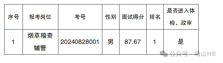 根據(jù)《峨山彝族自治縣公安局公開招聘警務(wù)輔助人員公告》,通過報名、資格審查、面試,現(xiàn)將成績予以公示,并將進入下一環(huán)節(jié)—體檢、政審人員名單進行公示如下: