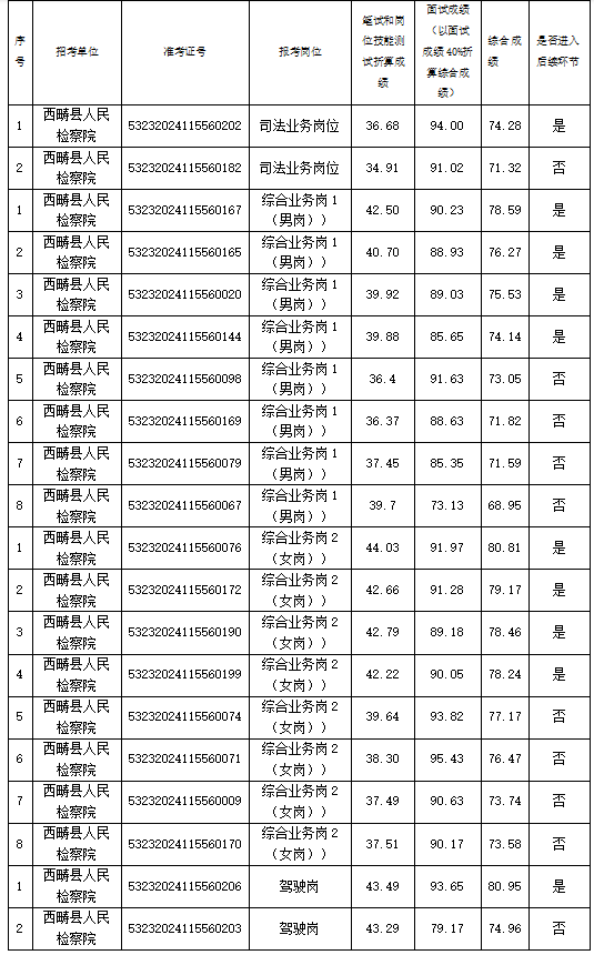 根據(jù)《2024年西疇縣人民檢察院公開招聘編外檢察輔助人員公告》安排,報(bào)考西疇縣人民檢察院編外檢察輔助人員崗位的考生已于2024年9月24日面試完畢,現(xiàn)將考生綜合成績(jī)公告如下,請(qǐng)進(jìn)入體檢環(huán)節(jié)的考生按照招聘單位通知要求參加體檢。
