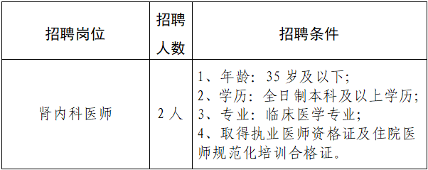 根據(jù)醫(yī)院業(yè)務(wù)發(fā)展需求,現(xiàn)需招聘腎內(nèi)科編外醫(yī)生2人,具體招聘條件如下: