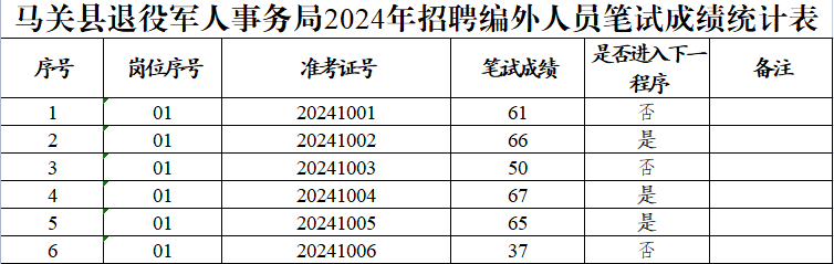 附件:馬關(guān)縣退役 軍人事務(wù)局2024年招聘編外人員筆試成績統(tǒng)計(jì)表