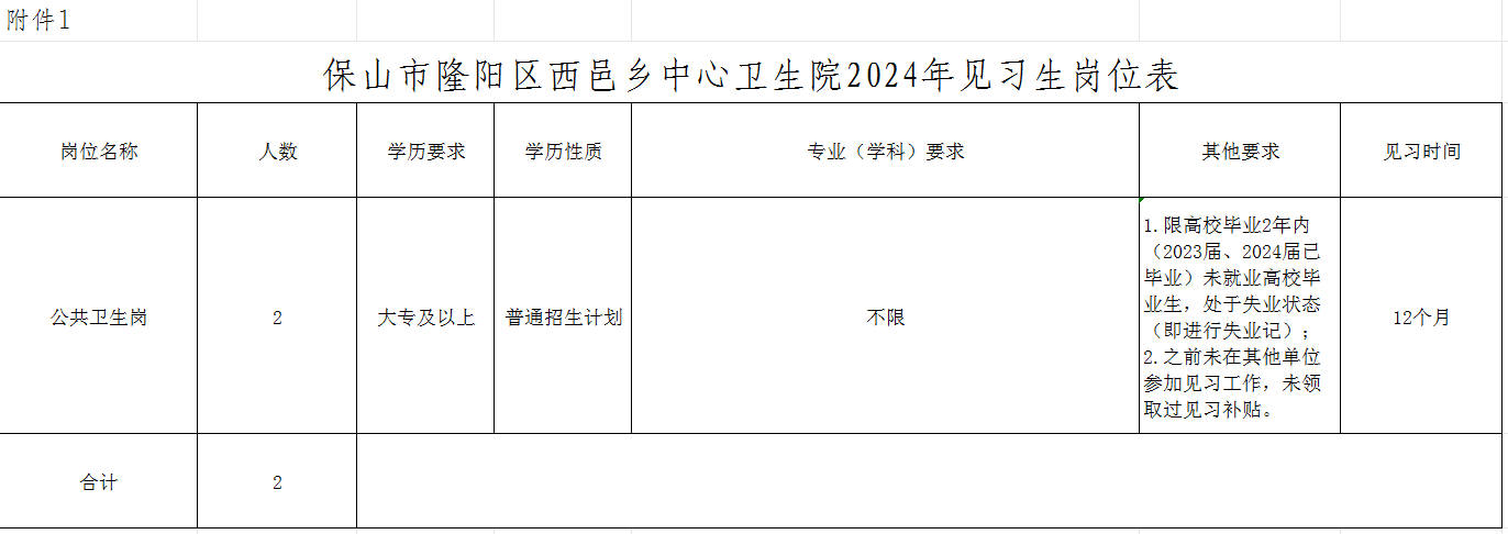 附件1:保山市隆陽區(qū)西邑鄉(xiāng)中心衛(wèi)生院2024年見習生崗位表(2).xlsx