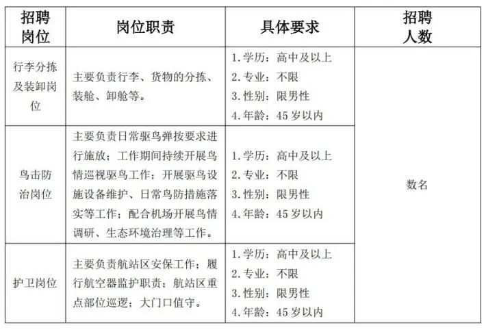 根據(jù)工作需要,公司決定面向社會公開招聘迪慶香格里拉機場網(wǎng)點行李分揀及裝卸員、護衛(wèi)員、鳥擊防治員等?,F(xiàn)將招聘內(nèi)容公告如下: