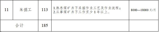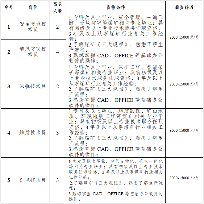 原則上年齡一般不超45周歲,特殊崗位技術(shù)人才可適當(dāng)放寬年齡至50周歲以?xún)?nèi),但需個(gè)人確保到齡退休時(shí),養(yǎng)老保險(xiǎn)繳費(fèi)年限符合退休條件;持有井下相關(guān)操作技能等證書(shū)優(yōu)先考慮;身體健康,無(wú)相關(guān)職業(yè)禁忌癥。