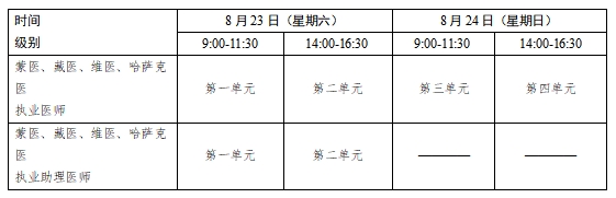 考試實行計算機化考試,軍隊現(xiàn)役人員加試軍事醫(yī)學、院前急救崗位和兒科專業(yè)加試相應(yīng)內(nèi)容。中醫(yī)類別蒙醫(yī)、藏醫(yī)、維醫(yī)、哈薩克醫(yī)專業(yè)實行紙筆考試。統(tǒng)一考試時間如下: