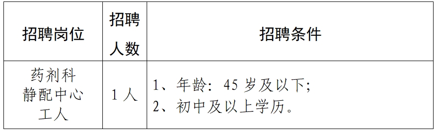 【招聘】藥劑科靜配中心需招聘勞務派遣工作人員1名