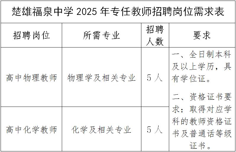 楚雄福泉中學關(guān)于2025年公開招聘部分學科專任教師的公告(一)