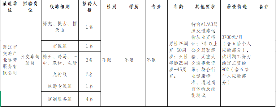 澄江市交旅產(chǎn)業(yè)運(yùn)營(yíng)服務(wù)有限公司因工作需要,委托澄江市啟澄人力資源有限責(zé)任公司,面向社會(huì)公開(kāi)招聘公交車(chē)駕駛員12名,現(xiàn)將有關(guān)事項(xiàng)公告如下: