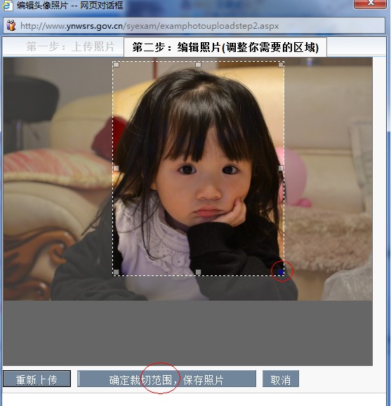 3.在上傳的第二步中,選定你要裁切的范圍,點確定即可。上傳完畢后,你可以看看你的照片是否清晰。