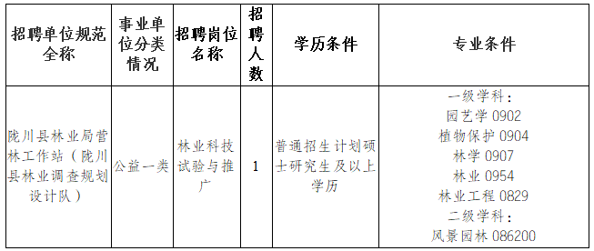 隴川縣林業(yè)局營(yíng)林工作站專(zhuān)業(yè)技術(shù)人員1名,具體崗位及招聘條件等詳見(jiàn)下表。