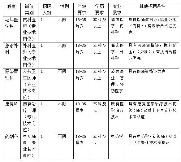一、此次面向社會公開招聘內(nèi)科醫(yī)師1名、外科醫(yī)師1名、公共衛(wèi)生醫(yī)師1名、康復(fù)治療師1名、中藥師1名,共計5人。(性別不限)