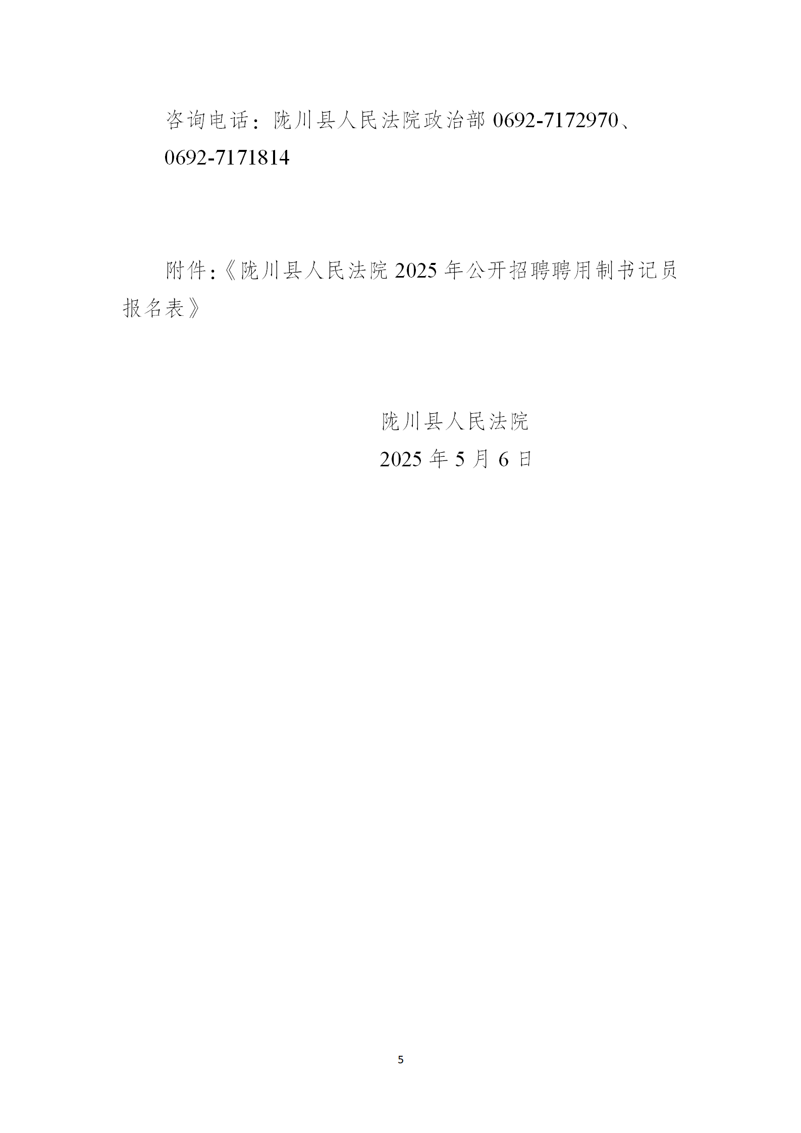 隴川縣人民法院2025年公開招聘聘任制書記員公告