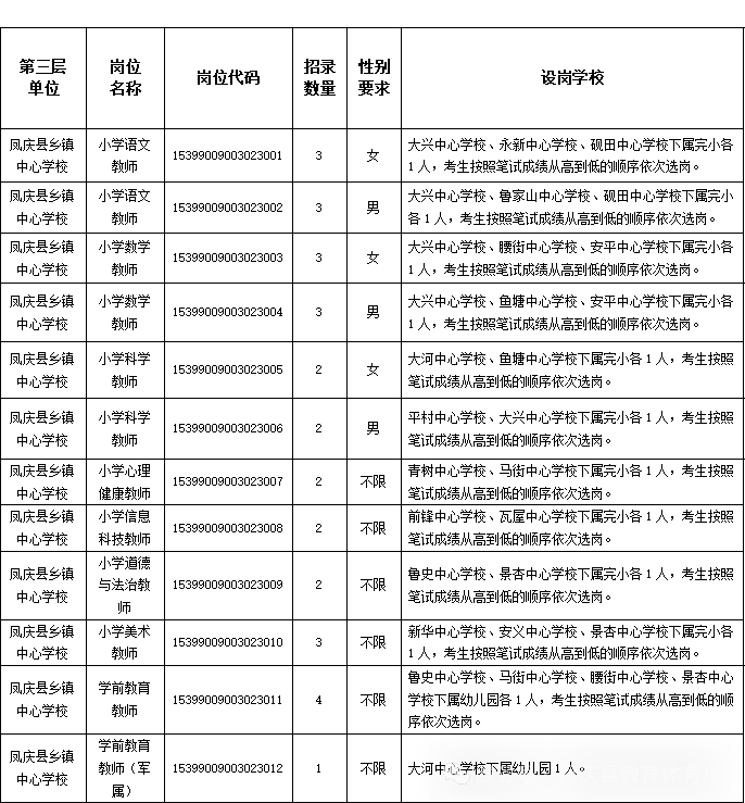 根據(jù)《臨滄市人力資源和社會保障局關(guān)于2025年全市事業(yè)單位公開招聘工作人員考試的公告》有關(guān)要求,鳳慶縣公開招聘鄉(xiāng)鎮(zhèn)小學(xué)教師30名,分為12個大崗位進(jìn)行招聘。為做好30名鄉(xiāng)鎮(zhèn)小學(xué)教師的資格復(fù)審、體檢、考察和聘用工作,經(jīng)縣人民政府審核同意,現(xiàn)將大崗位學(xué)校設(shè)置公告如下: