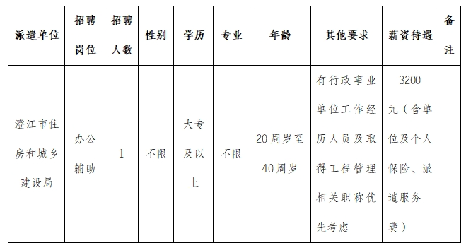 澄江市住房和城鄉(xiāng)建設(shè)局因工作需要,現(xiàn)委托澄江市啟澄人力資源有限責(zé)任公司,面向社會(huì)公開招聘辦公輔助工作人員1名,現(xiàn)將有關(guān)事項(xiàng)公告如下: