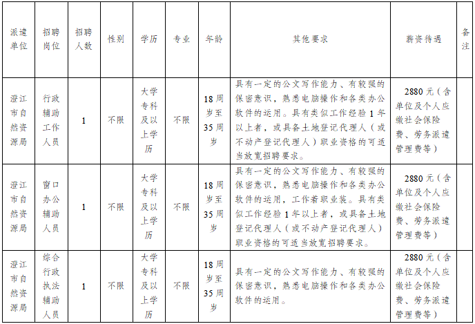 澄江市自然資源局因工作需要,委托澄江市啟澄人力資源有限責任公司面向社會公開招聘派遣輔助工作人員3名,現(xiàn)將有關(guān)事項公告如下: