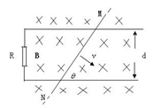 2. 如圖所示,平行導軌間距為d=1m,一端跨接一個電阻R=2Ω。勻強磁場B=0.5T,方向垂直于平行金屬導軌所在平面。一根金屬棒與導軌成Θ=60。角放置,金屬棒與導軌的電阻均不計。當金屬棒沿垂直于棒的方向以恒定速度v=4m/s在金屬導軌上滑行時,通過電阻R的電流是多少?