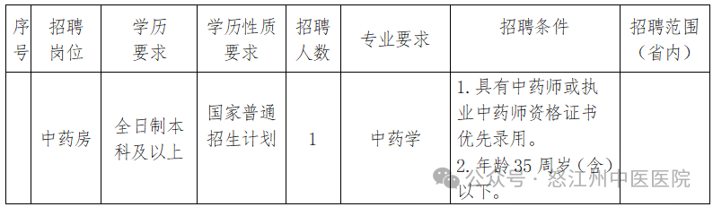 中藥房崗位:全日制本科及以上學(xué)歷,取得畢業(yè)證書、學(xué)位證(具有中藥師或執(zhí)業(yè)中藥師資格證書優(yōu)先錄用)。