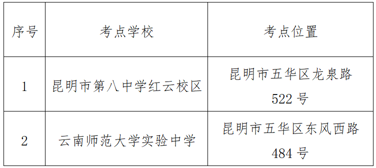 五華區(qū)共設(shè)2個(gè)考點(diǎn)??忌筛鶕?jù)準(zhǔn)考證信息確認(rèn)自己的考點(diǎn),避免找錯(cuò)考點(diǎn)、進(jìn)錯(cuò)考場。考點(diǎn)具體地址如下:重點(diǎn)提醒: