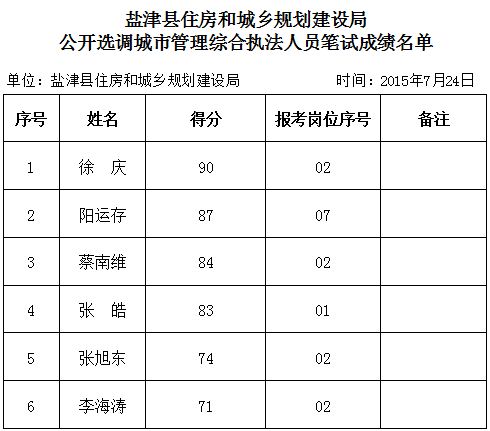 一、鹽津縣住房和城鄉(xiāng)規(guī)劃建設(shè)局公開選調(diào)城市管理綜合執(zhí)法人員筆試成績(jī)(詳見附表);