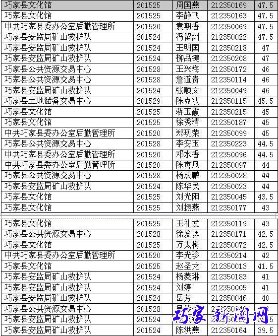 經(jīng)巧家縣縣直單位公開選調(diào)工作領(lǐng)導(dǎo)組研究決定,本次公開選調(diào)筆試最低合格分?jǐn)?shù)線確定為50分,即參加面試的人員筆試成績(jī)須達(dá)到最低控制分?jǐn)?shù)線50分及以上方可進(jìn)入面試。進(jìn)入面試名單如下: