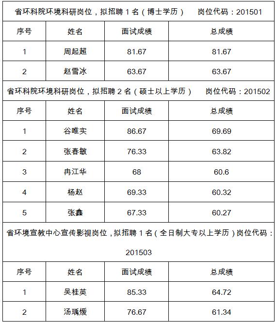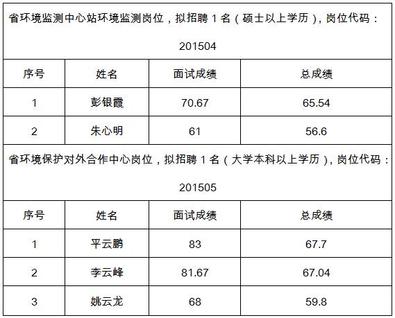 現(xiàn)將省環(huán)境保護(hù)廳直屬事業(yè)單位2015年公開招聘工作人員面試成績及總成績公示如下: