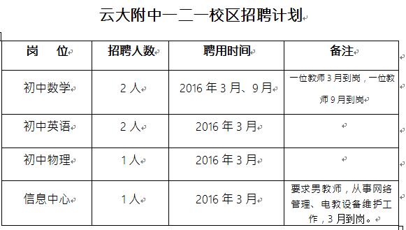 為適應(yīng)學(xué)校發(fā)展的需要,云南大學(xué)附屬中學(xué)一二一校區(qū)現(xiàn)面向全國招聘初中部分學(xué)科優(yōu)秀教師(具體招聘計劃見附表)。