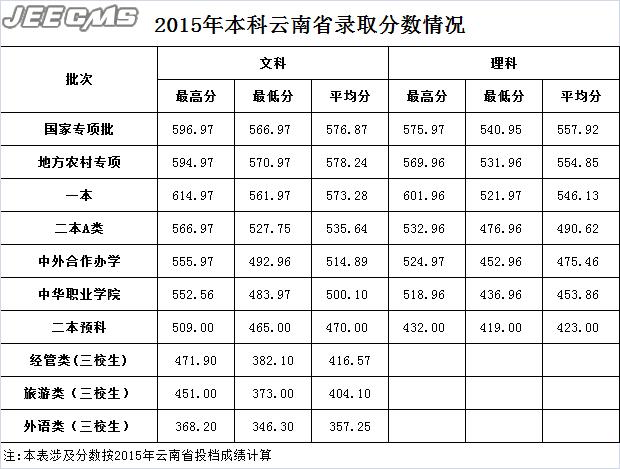 云南財經(jīng)大學2015年本科云南省錄取分數(shù)情況