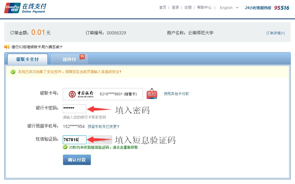 5.根據(jù)提示分別在對應的框內(nèi)輸入“銀行卡密碼”和手機短信接收到的“驗證碼”,確認無誤后點擊“確認付款”