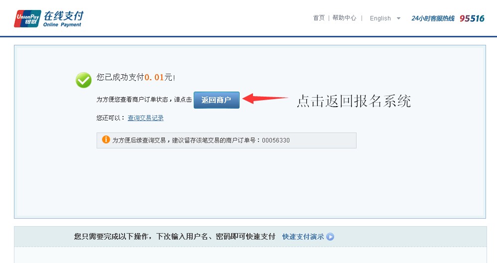 6.支付成功后,點擊“返回商戶”,返回報名系統(tǒng)繼續(xù)考試報名的其他操作。
