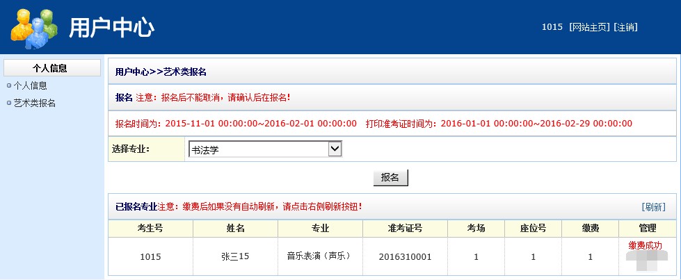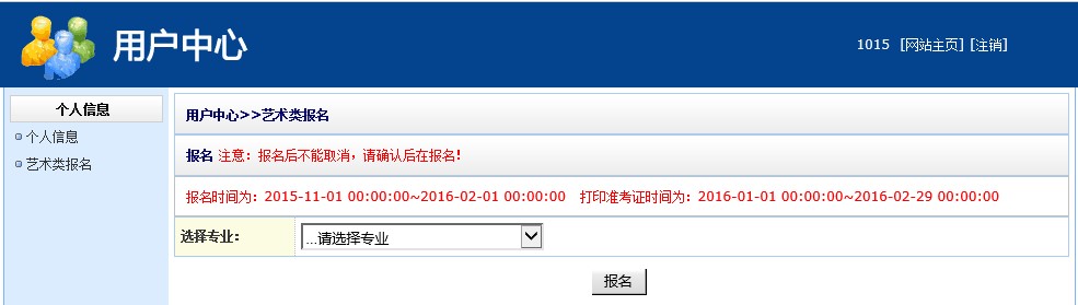 系統(tǒng)登錄后,會跳轉(zhuǎn)到后臺頁面,如圖3。仔細核對自己的個人信息,確認無誤后,點擊“報名入口”或者“藝術(shù)類報名”進入報名界面。