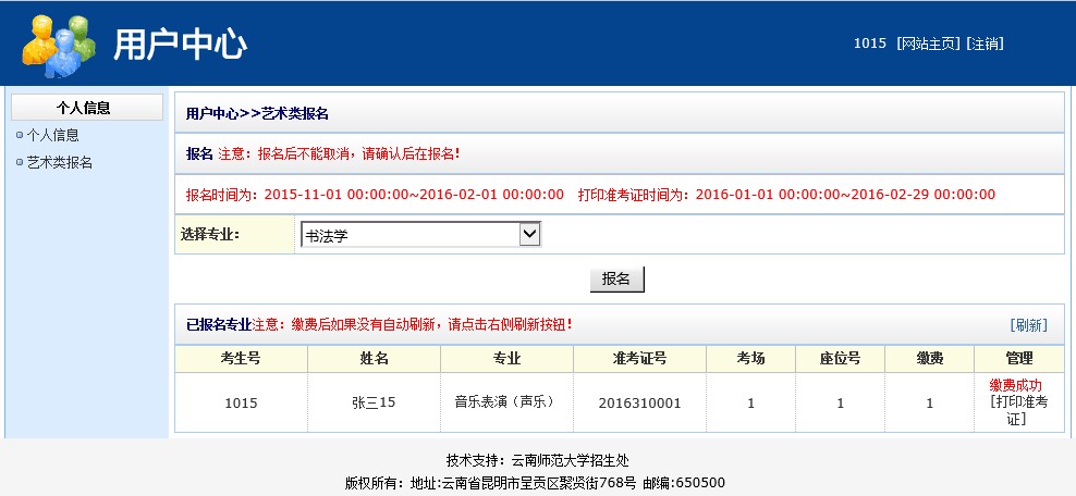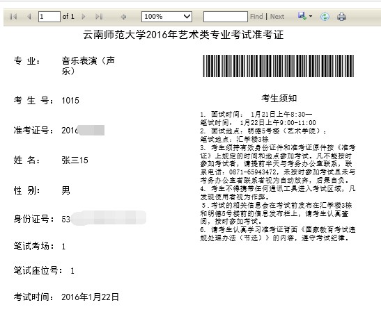 在2016年的1月20-21日,登錄該系統(tǒng),具體步驟與前面一致。點擊頁面中的“藝術(shù)類報名“按鈕。點擊“管理”欄下方的“打印準考證”按鈕,即可跳出準考證頁面,如圖17所示。