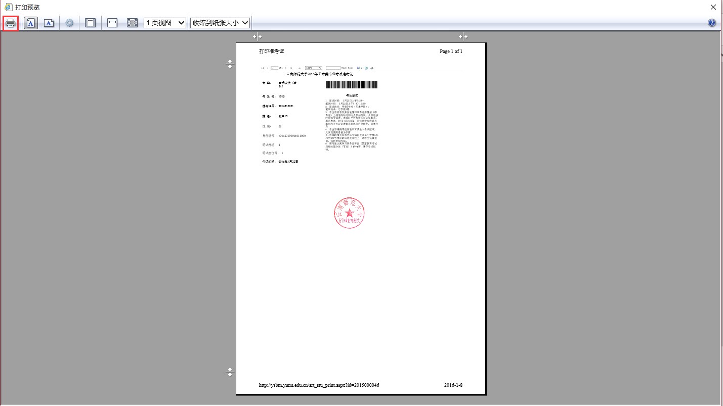點擊 “打印”按鈕,即可打印準考證,如圖20所示。