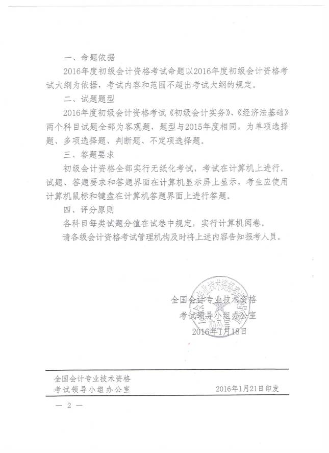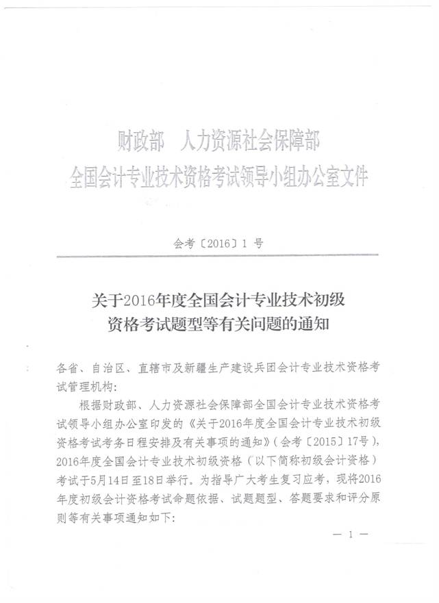 附件:全國會計考辦《關于2016年度全國會計專業(yè)技術初級資格考試題型等有關問題的通知》(會考﹝2016)1號)