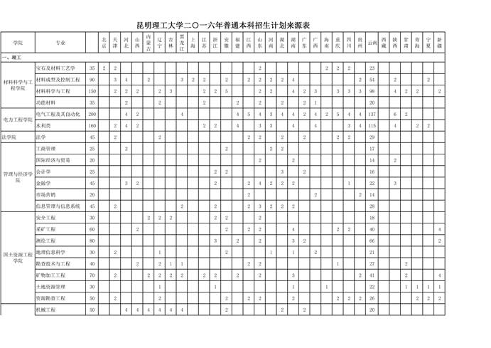 昆明理工大學(xué)2016年普通本科招生計(jì)劃來(lái)源表